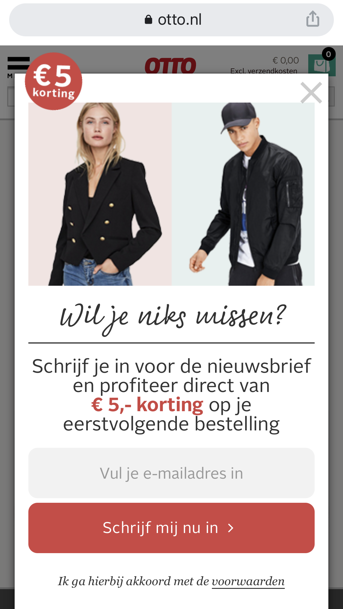 - Zorg voor een goede technische implementatie. Maak het gebruikers makkelijk om de pop-up simpel weg te kunnen klikken.Zorg ervoor dat de gebruiker het liefst op 4 manieren kan ‘ontsnappen‘: 1) cancel/afbreek button 2) close/kruisje button 3) escape-toets vanwege accessability regels 4) buiten het pop-up scherm kunnen klikken/tappen op de donkere achtergrond.