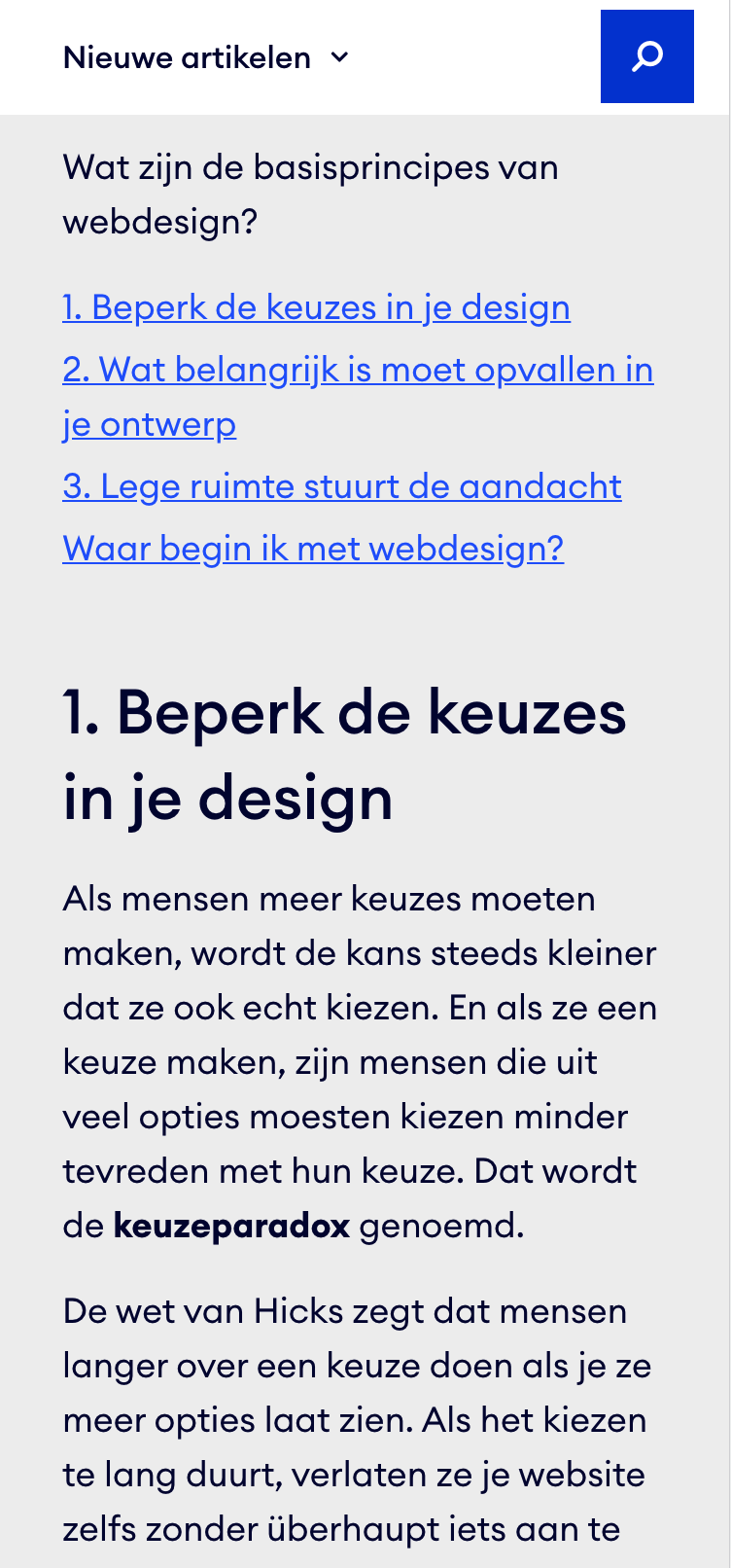 - Houd je website zo rustig mogelijk. Tegenwoordig zie je vaak een overload aan meldingen op een website, terwijl je er pas net bent. Denk aan een cookie-melding, een mededeling over corona, pop-ups en ga zo maar door. Probeer dit te voorkomen.
